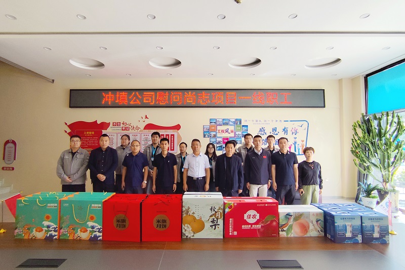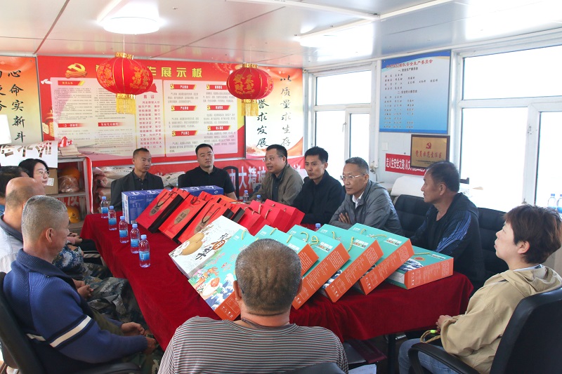 在中秋、国庆来临之际,冲填公司党委开展“双节”慰问活动,公司党委副书记、副董事长、总经理张志成,党委副书记、工会主席李正伟,副总经理韩雷,纪委书记王鹤飞,总会计师陈喜强,副总经理郭洋带队深入公司各在建项目,为坚守在生产一线的职工送上节日礼品与美好祝福。