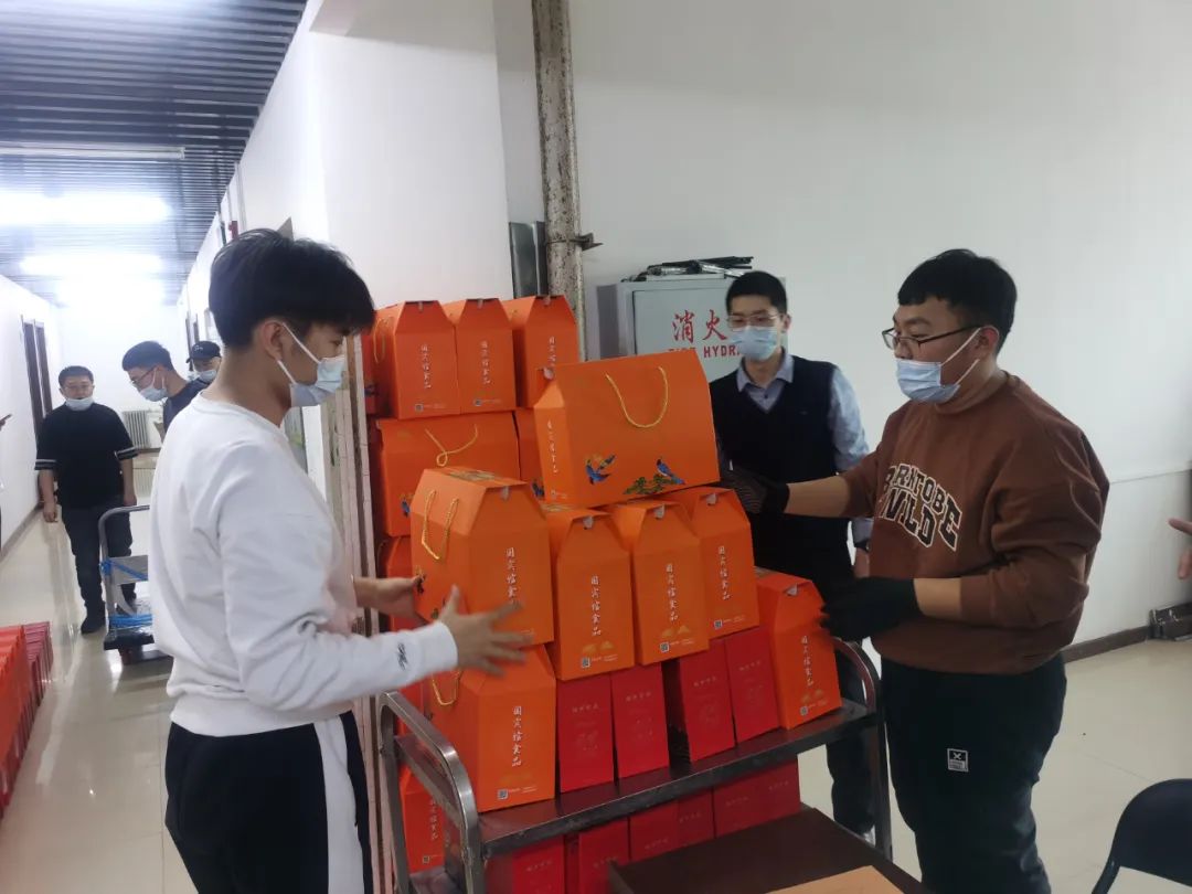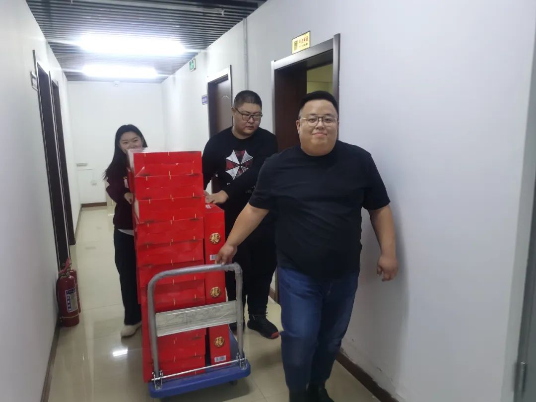 在礼品发放现场,男同事搬运,女同事帮忙,大家手提肩扛,你来我往,洋溢着春节浓厚的喜庆氛围。